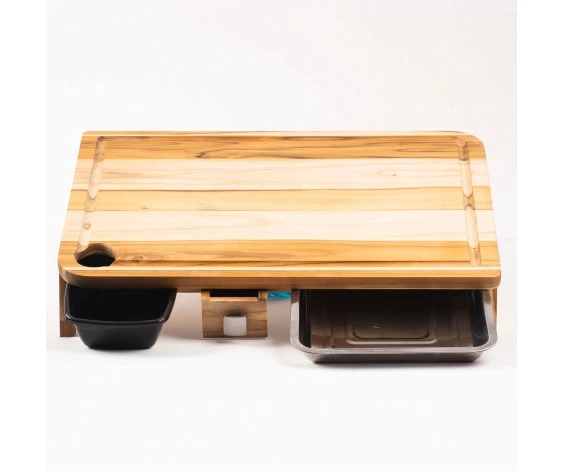 Um modelo novo, que além de tábua, conta com uma bandeja, pote, gaveta, para você armazenar seu churrasco e servir para todos os convidados.